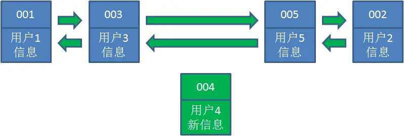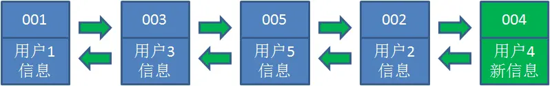 4.接下来,业务方请求修改用户4的信息。同样道理,我们把用户4从原来的位置移动到链表最右侧,并把用户信息的值更新。这时候,链表中最右端是最新访问到的用户4,最左端仍然是最近最少访问的用户1。
