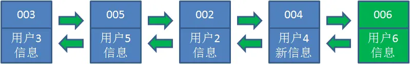 5.后来业务方换口味了,访问用户6,用户6在缓存里没有,需要插入到哈希链表。假设这时候缓存容量已经达到上限,必须先删除最近最少访问的数据,那么位于哈希链表最左端的用户1就会被删除掉,然后再把用户6插入到最右端。