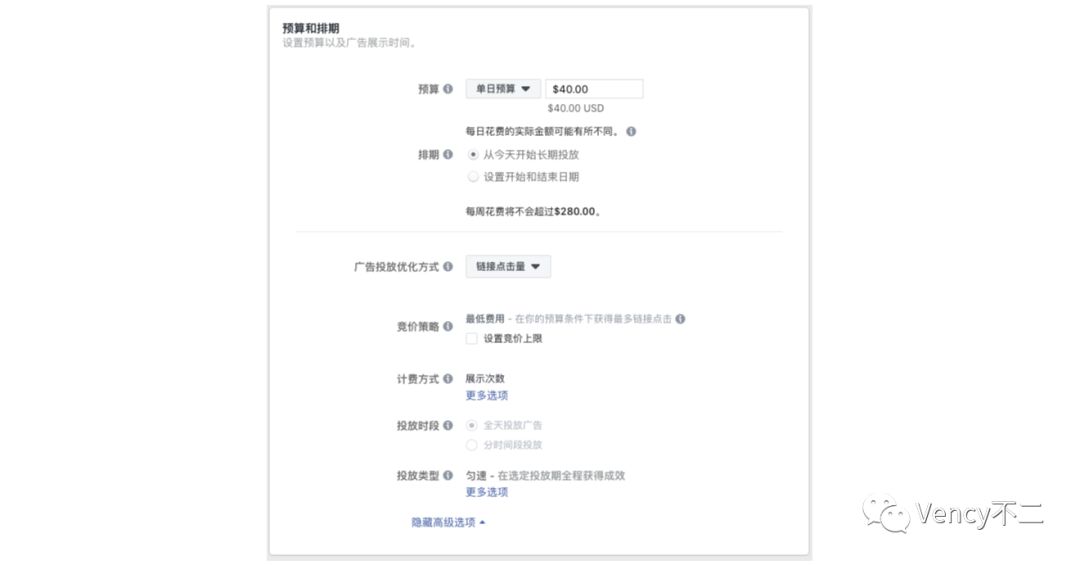 预算和排期模块中能够设置很多与投放策略直接相关的项。预算分单日预算(每日预算)和总预算,通过在不同广告系列/广告组中提升或降低预算,来提升或降低对应实例的重要性,例如某广告组测试发现买量成本较低,买到的量较多,就会提升预算来买到更多的量。