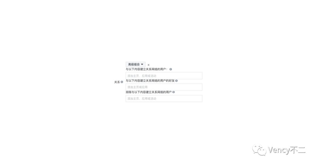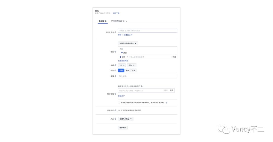 定位较为简单,包括地区、年龄、性别、语言、细分定位、关系。细分定位里面包含人口统计(学历、财务状况、父母、政治等)、兴趣(健身与养生、商业和工业、娱乐、家庭成员与感情状况等)、行为(手机品牌、侨民、周年纪念日、多元文化拥护者等),不得不说Facebook的细分定位极其详细。关系就是指与主页、应用、活动等建立关系的用户,一般用于排除已安装应用和已关注粉丝的用户。