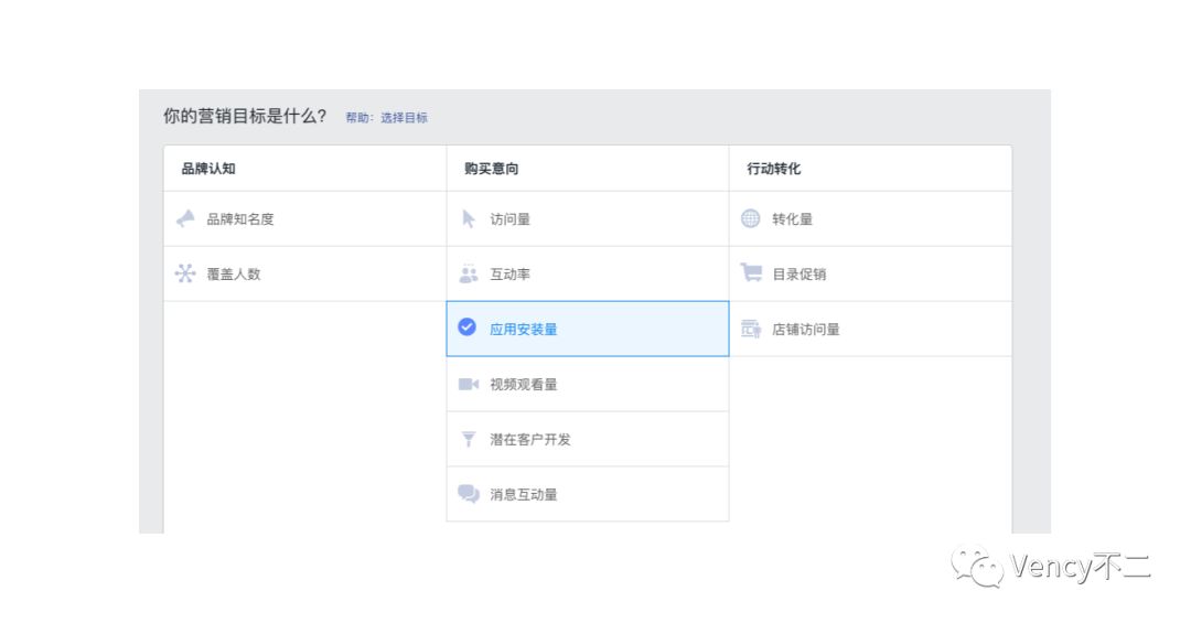 广告系列最重要的是用于确定营销目标和购买类型,营销目标是指投放广告的目的(希望用户在看到广告时采取的操作),品牌认知包括品牌知名度和覆盖人数,购买意向包括访问量、互动率、应用安装量、视频观看量、潜在客户开发、消息互动量,行动转化包括转化量、目录促销、店铺访问量。