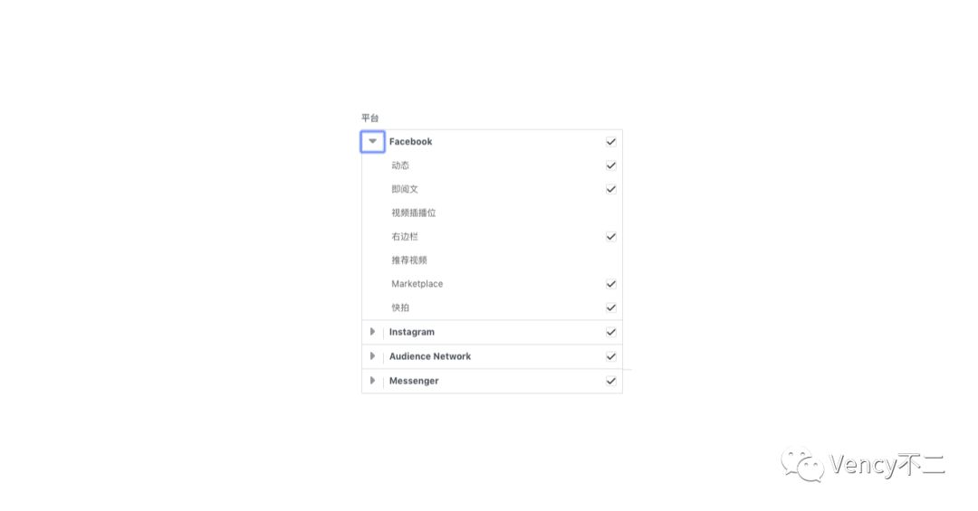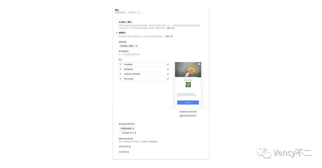 选择编辑版位,可自行选择平台,平台中包括Facebook、Instagram、Audience Network、Messenger,不同平台有不同特点,平台下还能选择广告位。除了Audience Network其他都是Facebook旗下产品,Audience Network则是Facebook的广告联盟。
