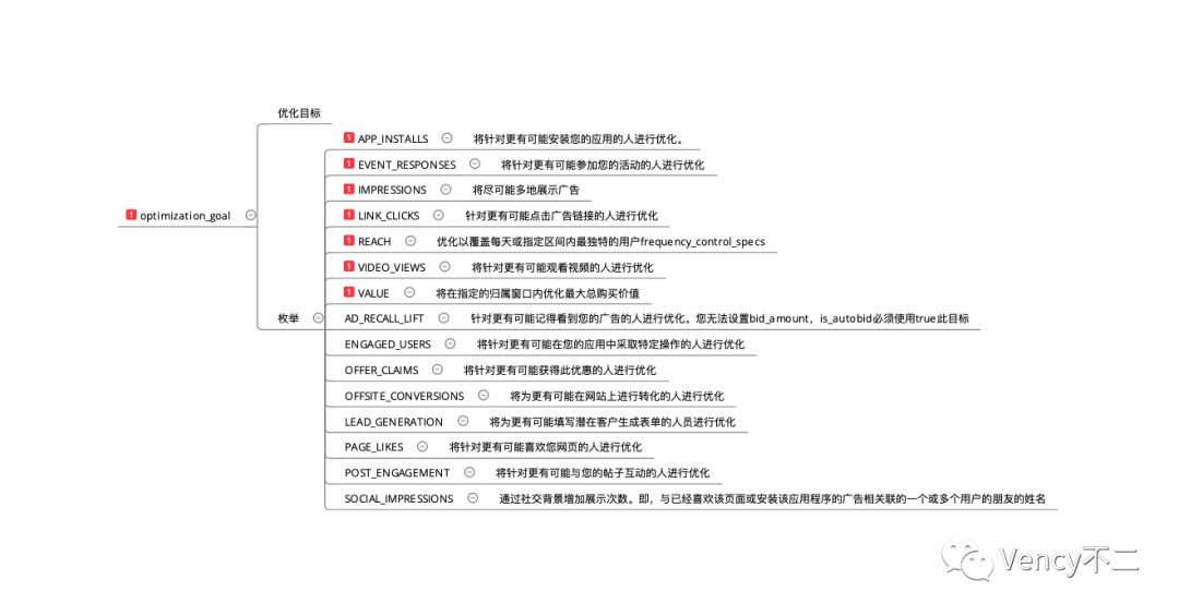 计费方式是指以广告主希望以什么指标作为扣除预算的标准,与费用直接相关。供选择的计费方式与营销目标直接相关,安装应用量的营销目标下的广告组自然不支持选择OFFER_CLAIMS等计费方式。观察计费方式可以看到,某些计费方式比另一些计费方式处于营销漏斗的层次更高,更容易花出去钱。Facebook要求某广告账户下积累到某一定量时,才可以开通某些计费方式,例如APP_INSTALLS要求此广告账户下有一定安装量,因为没有安装量就以APP_INSTALLS计费进行投放,极有可能投不出去,没有任何量。