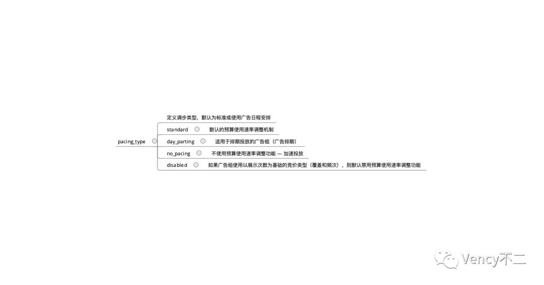 投放时段和投放类型都由pacing_type控制,投放时段就是哪些天的几点到几点投放广告,时间相关的都要注意时区;投放类型就是匀速或者加速。预算使用速率调整功能考虑到会出现投放期间某段时间竞争非常激烈的情况下,通过匀速的投放类型,能够确保在广告组排期内均匀地花费您的预算。很明显,一般都用均匀的投放类型。