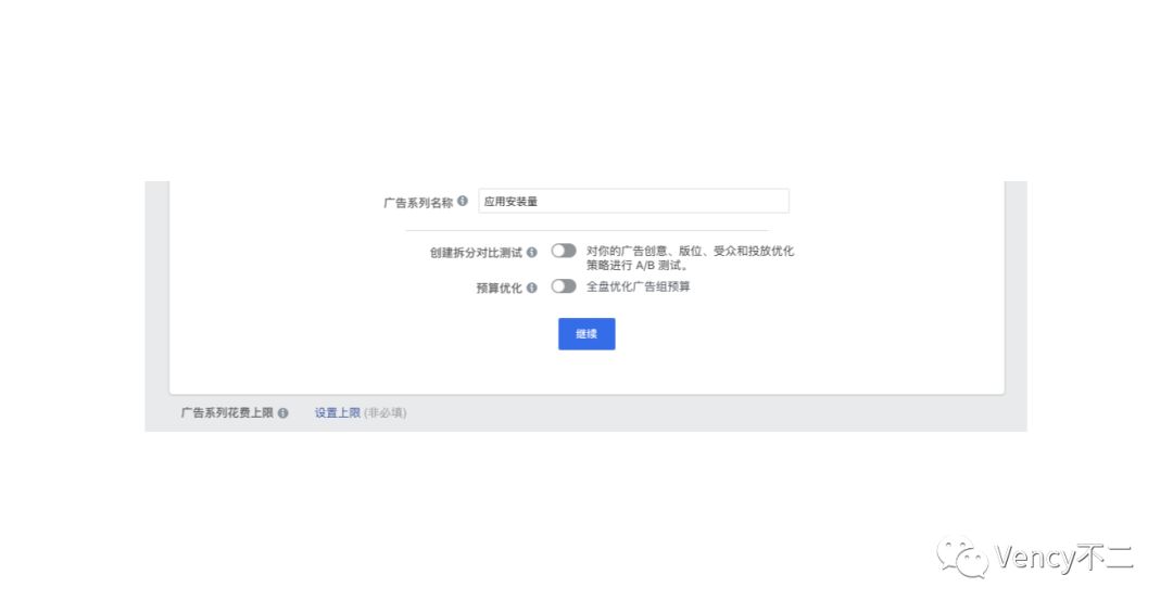 广告系列设置中除了营销目标以外,还有广告系列名称、创建拆分对比测试、预算优化、广告系列花费上限和Marketing API中独有的功能。创建拆分对比测试以后再讲,也是很有意思的。预算优化就是指通过每天为此广告系列下的所有广告自动重新平衡预算来全盘优化广告组预算。广告系列花费上限是指为广告系列设置预算。