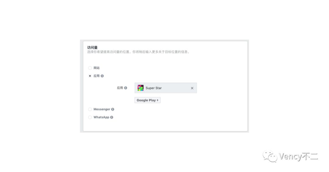 投放主体和广告系列中的“营销目标”有关,营销目标设置为应用安装量,则需要选择合适的应用作为投放主体,营销目标设置为访问量,则需要选择合适的链接作为投放主体,也可以直接设置Messenger或者WhatsApp。