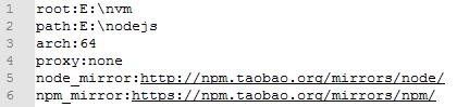 (2)我们在E盘底下新建文件夹E:/nvm,将第(1)步解压缩得到的文件列表复制到该文件夹,新建文件夹E:/nodejs用于存放node的安装依赖