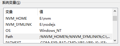 (1)第2步点击install.cmd文件后,会在环境变量的系统变量中,生成两个环境变量:NVM_HOME 和 NVM_SYMLINK 我们开始修改这两个变量名的变量值:NVM_HOME的变量值为:E:\nvm; NVM_SYMLINK的变量值为:E:\nodejs,然后在在Path的最前面输入: ;%NVM_HOME%;%NVM_SYMLINK%; 如下所示