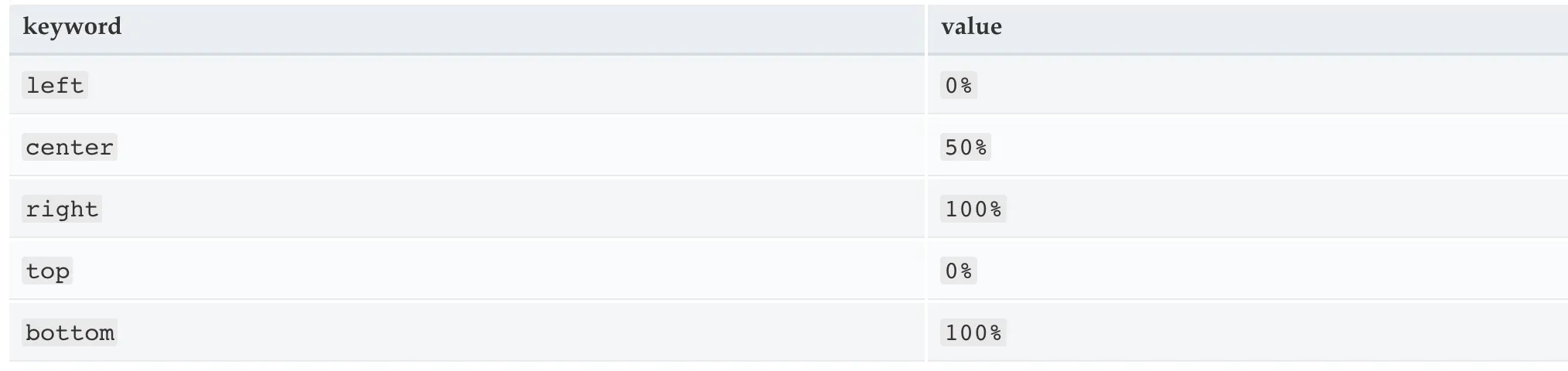 - 一个值: 必须是< length>,< percentage>,或 left, center, right, top, bottom关键字中的一个。