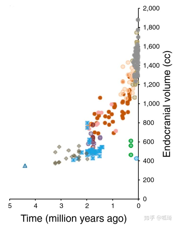 按照目前学术界的主流观点,人类是由生活在距今约400万~100万年前的南非和东非的南方古猿进化而来的。如果我们回顾这段波澜壮阔的进化历史,我们会发现与我们其他同属人科的表兄弟们相比,我们的脑容量极其巨大。从图1可以看出,在过去数百万年这段相比于地球历史极为短暂的时间内,我们的脑容量从地猿和南方古猿的400ml左右增长到了现在的1400ml以上,扩大到了原来的三倍多(图1从左到右分别为地猿、南方古猿、能人、直立人、智人的数据,一般认为人类是由前四个物种依次进化来的)。