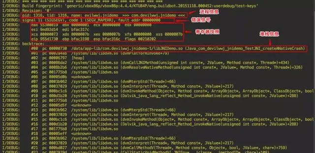 在上图里,堆栈信息中 pc 后面跟的内存地址,就是当前函数的栈地址,我们可以通过命令行arm-linux-androideabi-addr2line -e 内存地址得出出错的代码行数了。