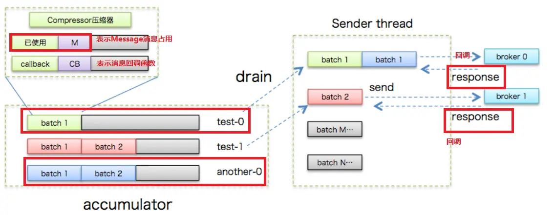 compressor: 负责执行追加写入操作 batch缓冲区:由batch.size参数控制,消息被真正追加写入到的地方 thunks:保存消息回调逻辑的集合 -
