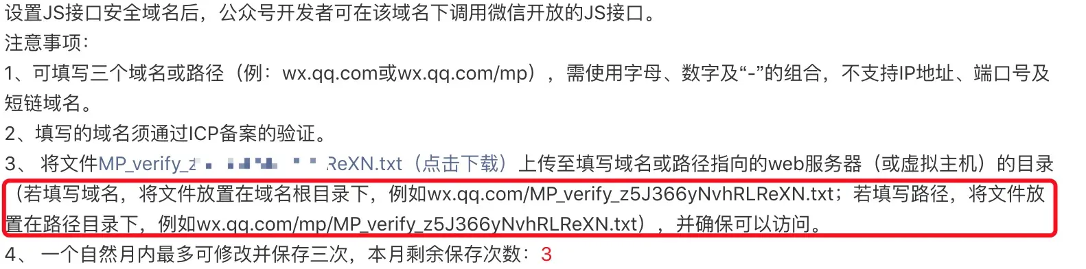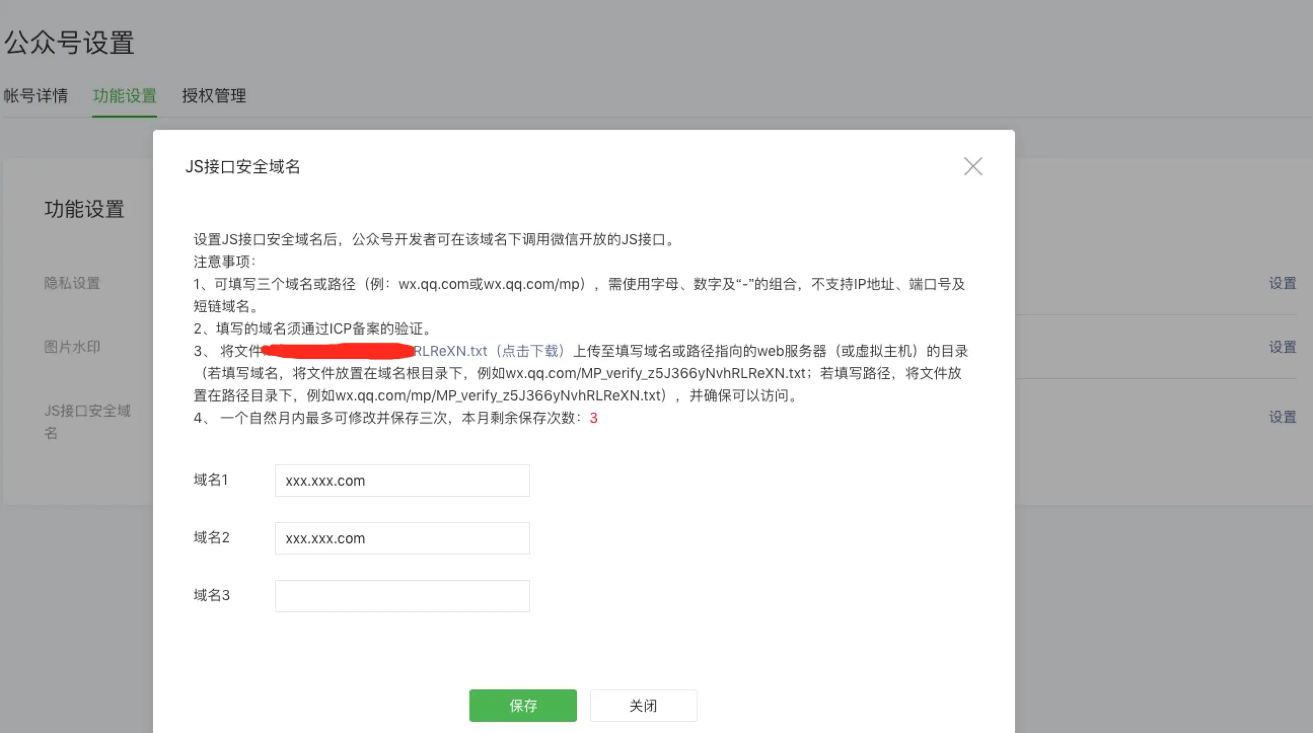 然后继续再 公众号设置>功能设置;配置js接口安全域名,这里介绍也很详细配置好域名,就可以调用js了,还有微信提供的签名文件要放到配置的域名下。