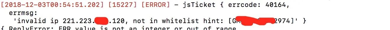 - 获取token,ticket报的错误 'invalid ip 221.223.000.000, not in whitelist hint:[]'提示的很明显了白名单没配对,解决简单粘贴提示的ip到公众号里面的ip白名单就好了;