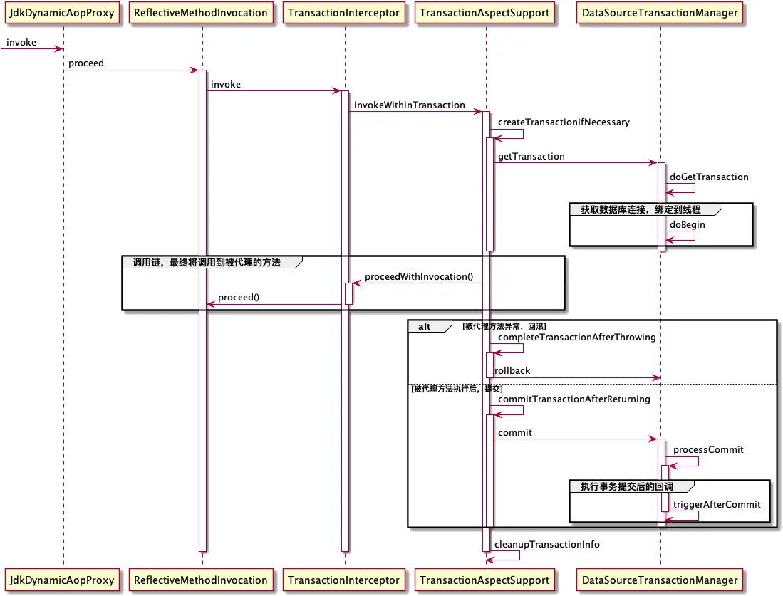 - 如果业务方法执行正常,提交事务;并且在DataSourceTransactionManager的实现中,可以注册回调让其在事务提交后进行执行(应用场景:1. 业务下单后,注册一个推送MQ消息的回调,此时如果正常提交下单的数据,则同步推送一个MQ消息;2. 清理缓存)