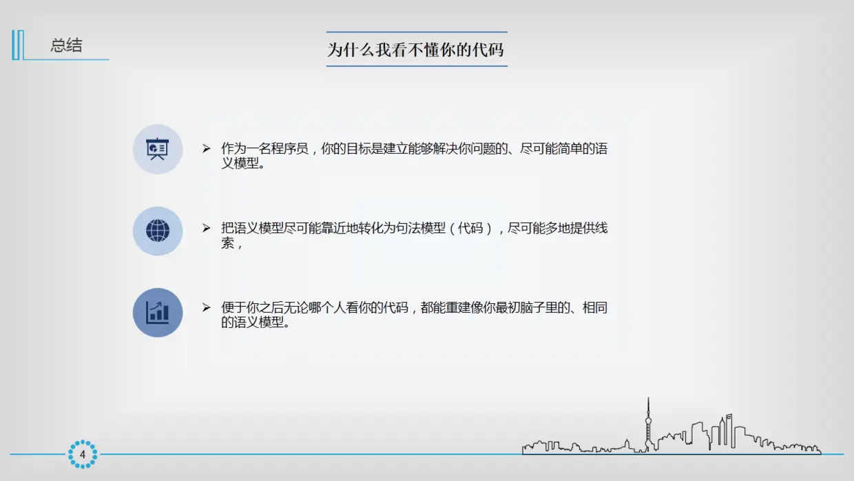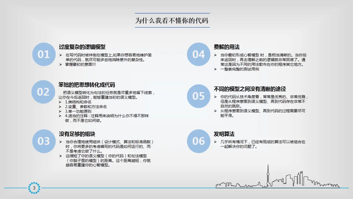 总结一句话:在你写代码的时候,你的脑子里会有一个完整的逻辑模型。你要尽可能的将你脑中的逻辑模型平滑的转化为你写的代码,让你过了一段时间之后、或者另外一个人 看到你的代码(或者根据注释),能够尽可能的重现出你当时写代码时脑海中的逻辑模型。