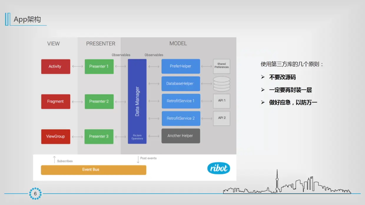 这里借用了EventBus的图, 感觉张图的 MVP 逻辑也挺清晰的,包括M层的封装。 这里提到了如何正确使用开源项目,也是属于model层的内容。