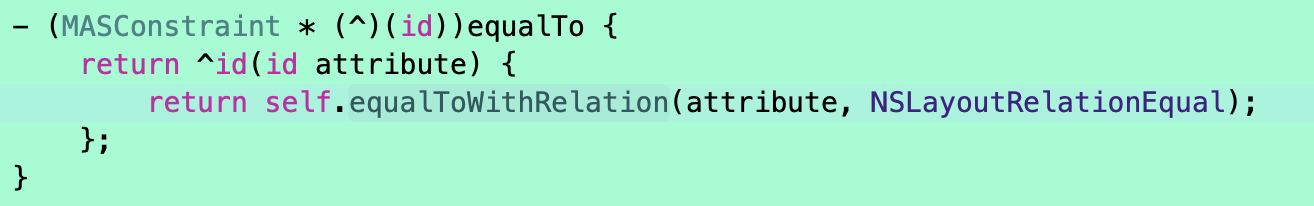 1.调用equalTo方法的对象是MASConstraint,equalTo方法里面声明了一个block和block的实现