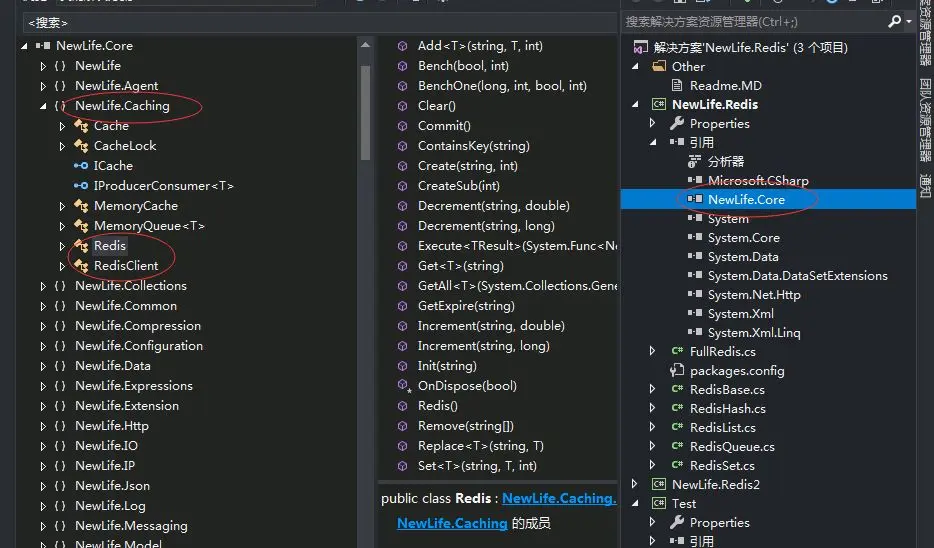 这里可以打开看一下,NewLife.Core里面有一个NewLife.Caching的命名空间,里面有一个Redis类,里面实现了Redis的基本功能;另一个类是RedisClient是Redis的客户端。
