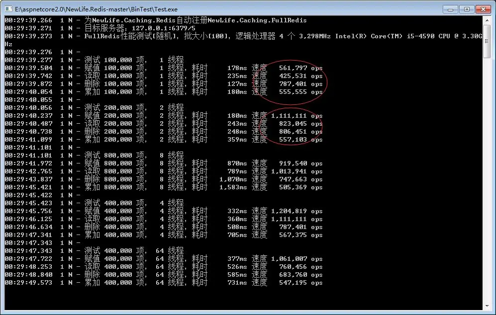 测试就是进行get,set remove,累加等的操作。大家可以看到在我本机上轻轻松松的到了六十万,多线程的时候甚至到了一百多万。