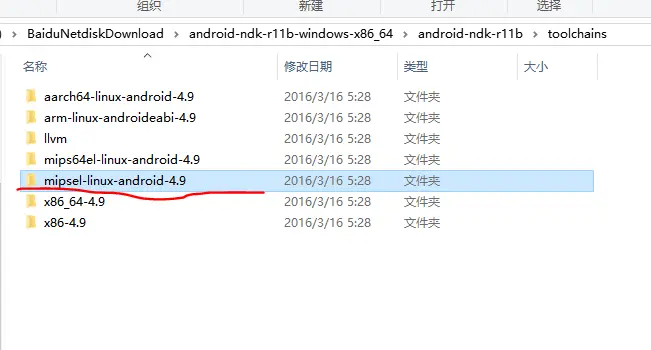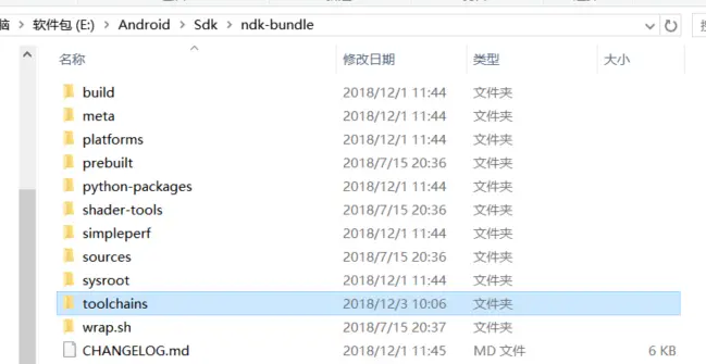 (2)复制NDK地址到本地电脑中进行查找,E:\Android\Sdk\ndk-bundle,找到toolchains文件夹并打开。