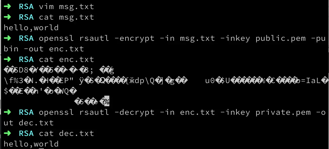 加密:openssl rsautl -encrypt -in msg.txt -inkey public.pem -pubin -out enc.txt