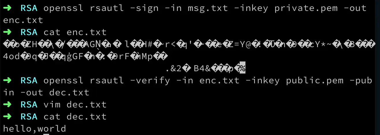 加密:openssl rsautl -sign -in msg.txt -inkey private.pem -out enc.txt
