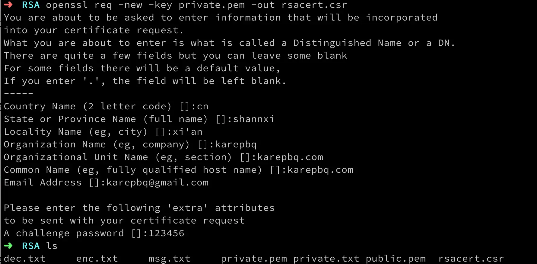 // 拿着 rsacert.csr 签名一个 rsacert.crt 证书