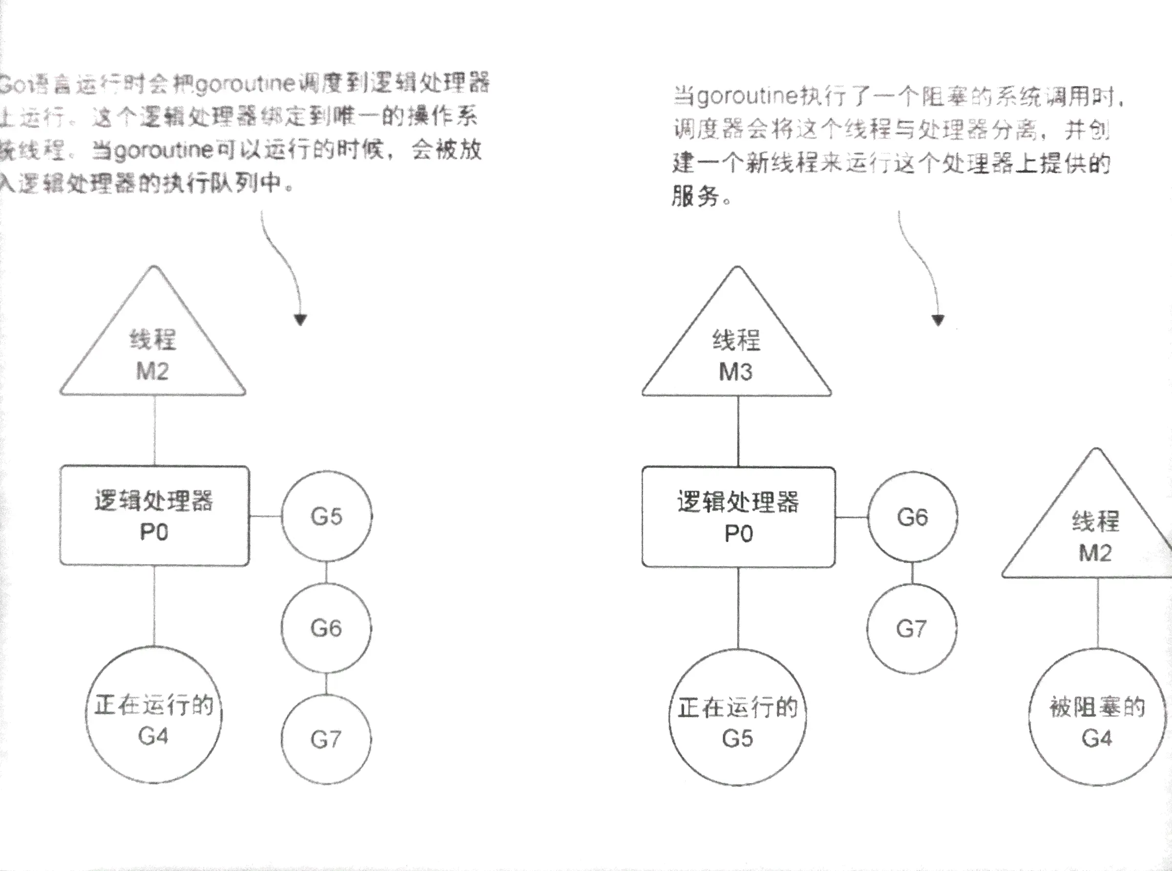 Go语言中有逻辑处理器(Logic Processor)的概念,通过它完成user thread的调度.