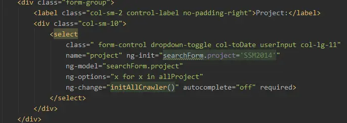 在project这里绑定是searchForm里面的project ng-init把数据初始化为SSM2014.