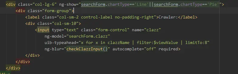 我之前提到的ng-blur,就是失去鼠标焦点就会执行的方法,因为这是在Crawler输入框内设置的方法,其实他在这里执行的是一个验证,毕竟是个输入框,虽然有提示信息,但是user不一定会去根据提示的信息输入正确的crawler,如果输入错误的怎么办呢,所以这里就执行了一个方法来验证。