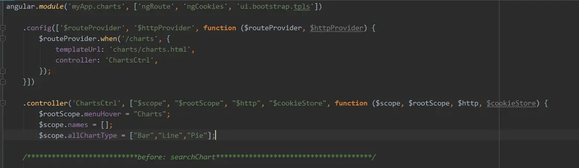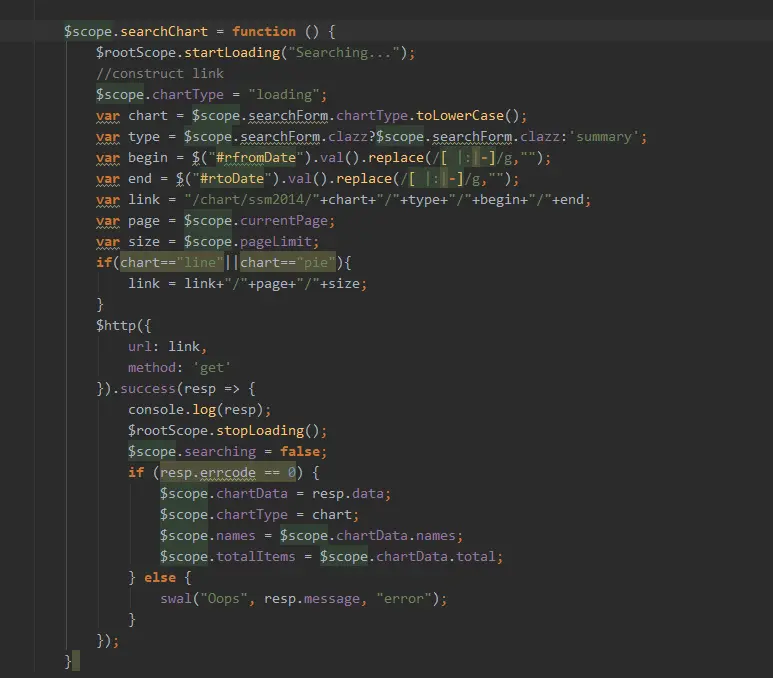 拼接请求的url: 获取各个输入框的值,如果是line和pie就再拼一个日期,哇,感觉这里的思维就跟我很不同,如果是我,我就会在写一个function,而其实只要简单写一个判断就行了,果然是思维不同,代码的复用性和模块化还没有能好好运用。