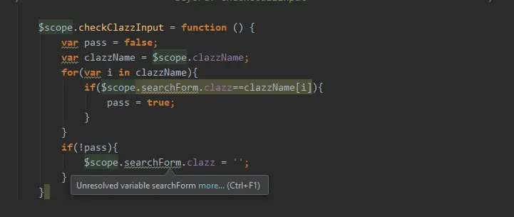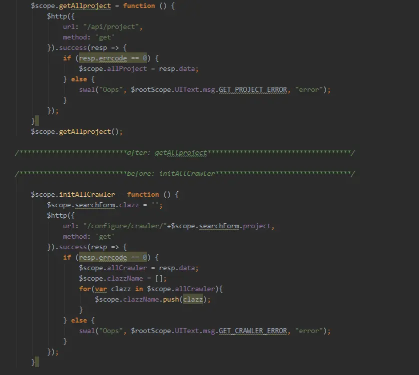 这里的?scope.clazzName是在?initAllCrawler的时候已经赋值了,里面是所有的Crawler。在输入框内,他已经绑定了数据(就是这个($scope.search.clazz),然后遍历所有的crawler看看是不是存在用户输入的值,如果存在,那么pass这个标识符就会被设置成true。不存在,就设置为空,传回来的所有的crawler的data。