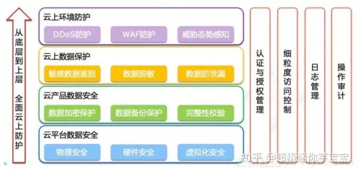 本方案的目标是为用户提供从底层云平台数据安全到上层的云上环境保护,并标明各层次模块,让用户可以像建房子一样,一层层的搭建可信的在云上数据的安全保护。在各横向层次模块之外,云上数据安全也需要纵向的认证、授权、访问控制和日志审计功能,从而为客户提供可控和合规的云上数据安全保护方案。