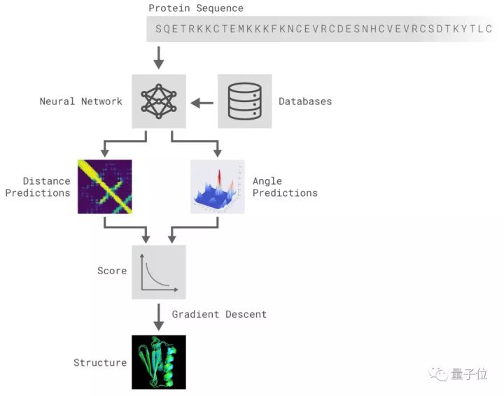 训练一个神经网络来预测蛋白质中每对残基之间的距离分布。然后,将这些概率组合成一个分数,用来估计一个蛋白质结构的准确度。