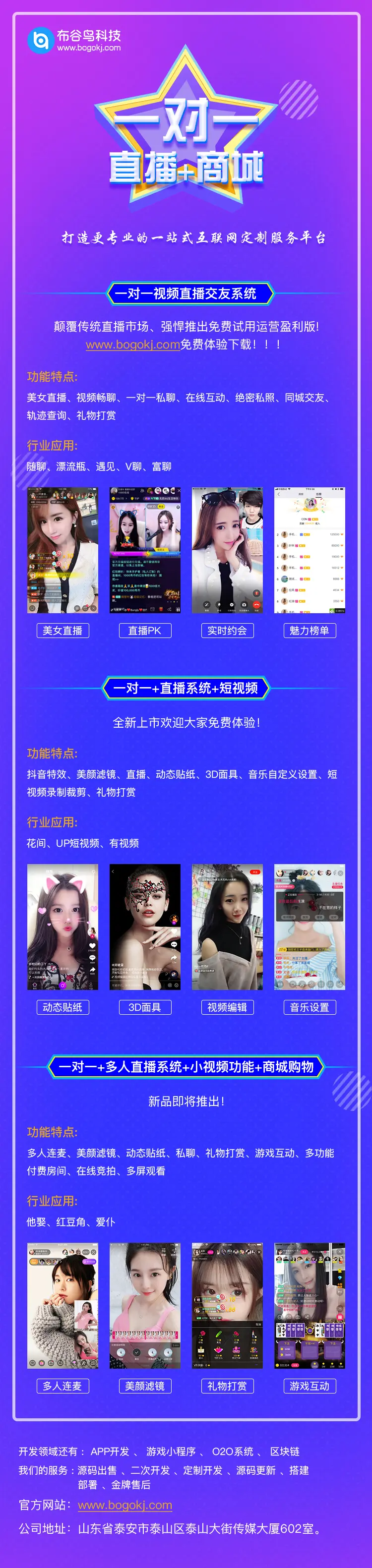 山东布谷鸟网络科技有限公司主开发一对一直播源码、一对一视频源码、交友源码、社交源码、一对一源码、短视频源码、有视频源码、抖音源码等开发。