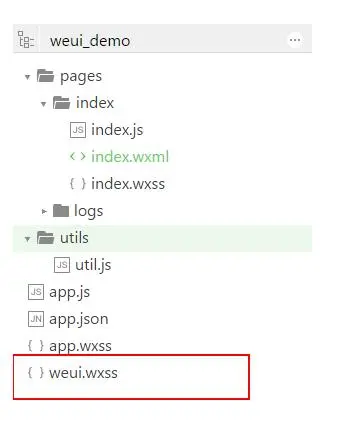 4、在项目中引用:在app.wxss中加入weui.wxss的引用- @import 'weui.wxss';