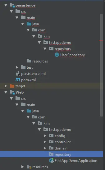 同样方法,建立persistence,把web中的repository中的class放入persistence中的repository中: