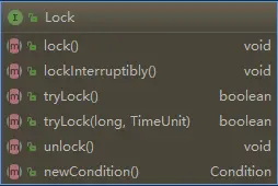 Lock接口为独占锁(同一时间共享资源只能由一个线程获取),共享锁(同一时间共享资源可由多个线程获取),公平锁(各个线程获得锁的机会是公平的),非公平锁(各个线程获得锁的机会是公平的),重入锁(线程在获取到锁之后,再次获取该锁而不会被该锁所阻塞,不会自己把自己锁在外面)提供了实现规范,接口中定义的方法如下: