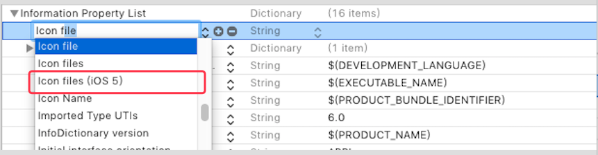 在Info.plist中添加Icon file (iOS 5)一列
