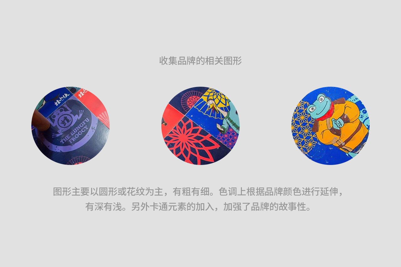 图形主要以圆形或花纹为主,有粗有细。色调上根据品牌颜色进行延伸,有深有浅。另外卡通元素的加入,也加强了品牌的故事性。