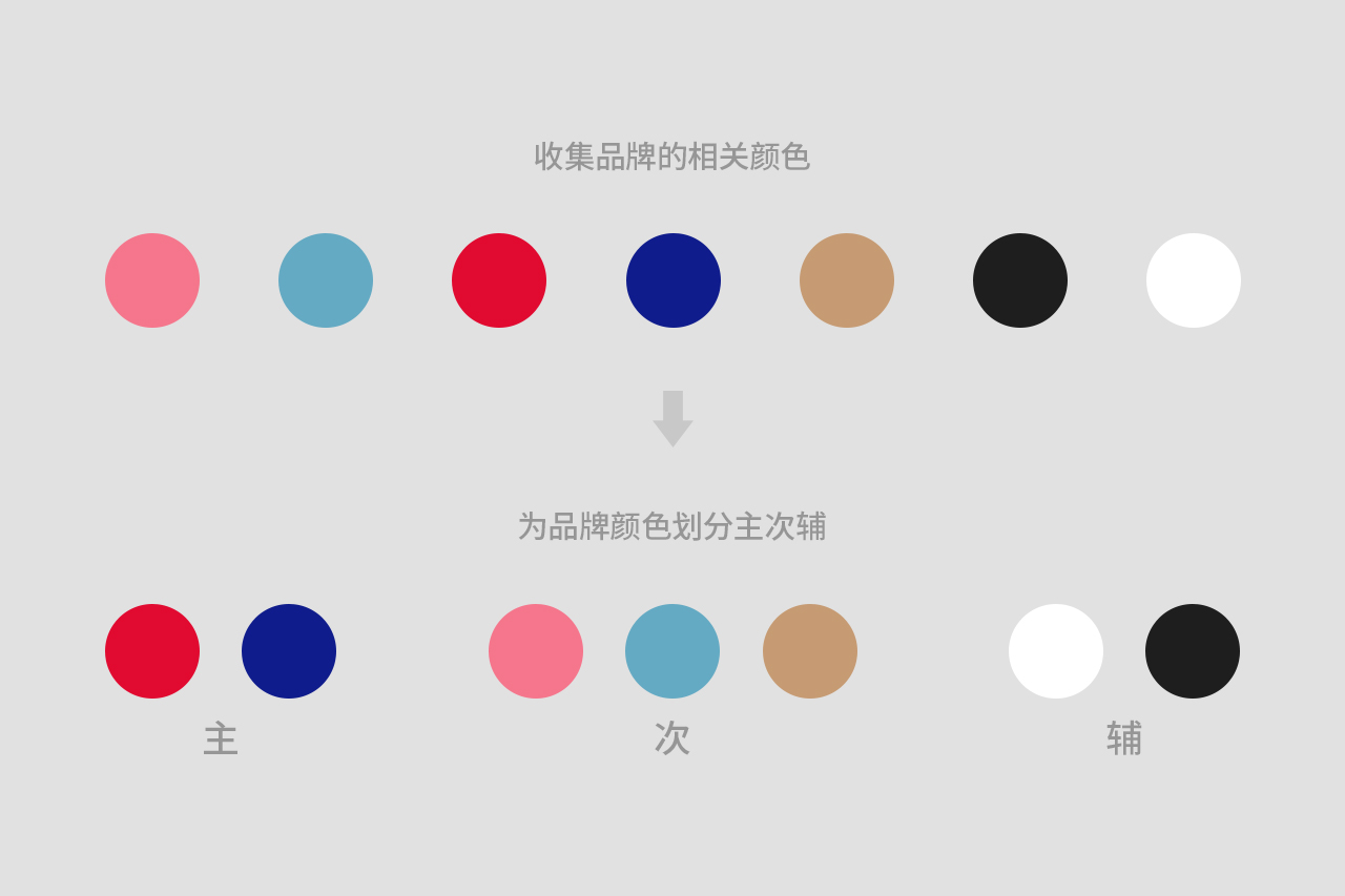 首先是收集品牌的相关颜色,然后结合方块理论,为这个品牌的颜色划分主次辅: