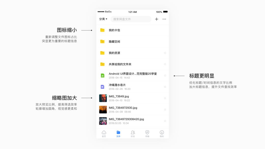 文件列表是用户使用网盘最高频的路径,针对这个场景,我们遵循视觉服从功能,极简克制的百度“高级感”设计理念,通过视觉手段区分信息层级,让用户浏览时“更便捷”。