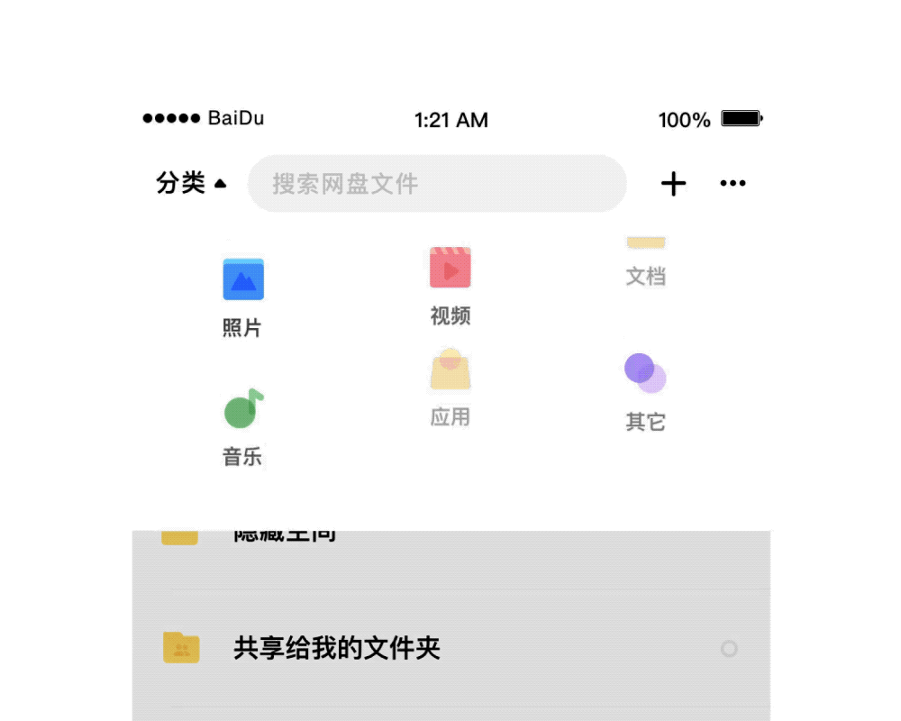 为了节省用户时间,传递品牌“更便捷”的理念,本次改版我们优化“分类”模块,将“分类”外置于首页顶部,减少用户操作步长,轻松查找自己的文件。