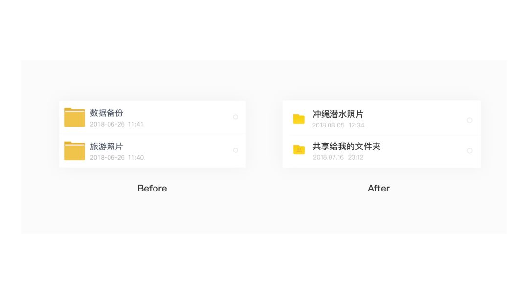 对于文件列表,信息层级重要性依次为:名称>图标>时间,因此,本次优化了视觉重量对比。通过视觉重量的处理(对标题字号加粗、颜色增强),让用户更加便捷的获取有效信息。