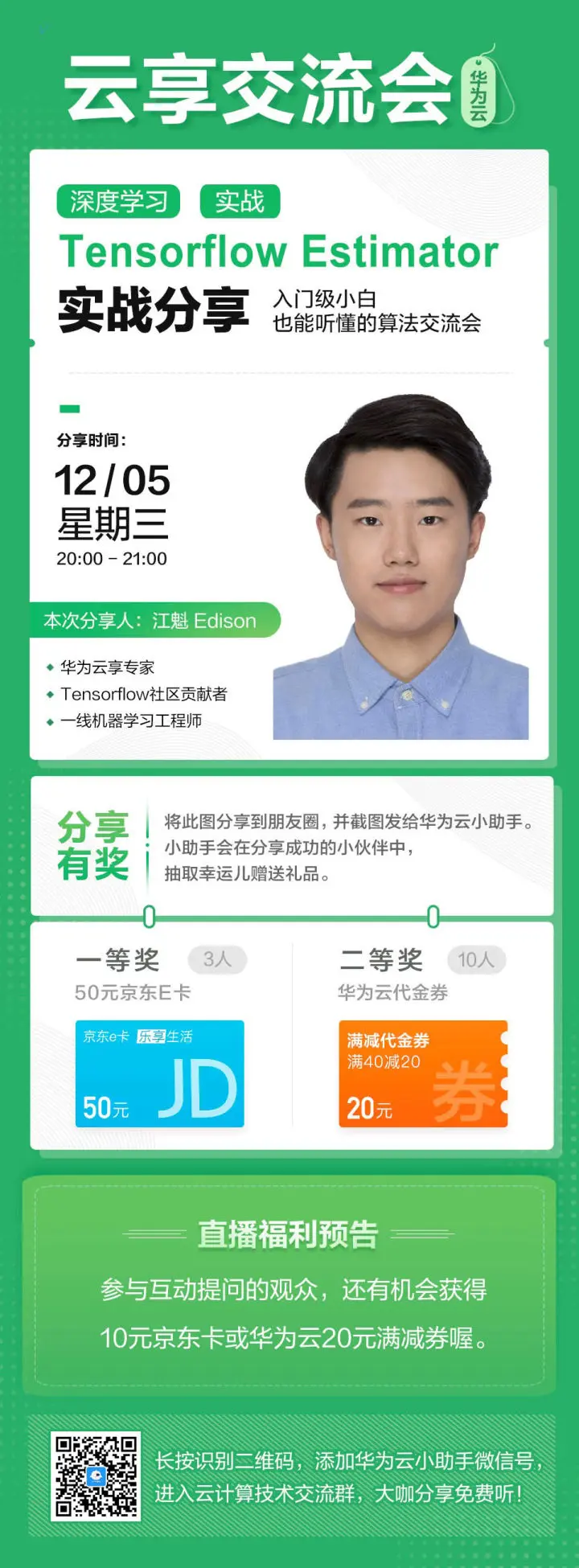 以往专家分享的内容太过高深很难听懂?不要担心这一次,华为云邀请云享专家,为大家准备了一场小白也听得懂的入门级直播课程!与你交流TensorFlow Estimator实战心得!
