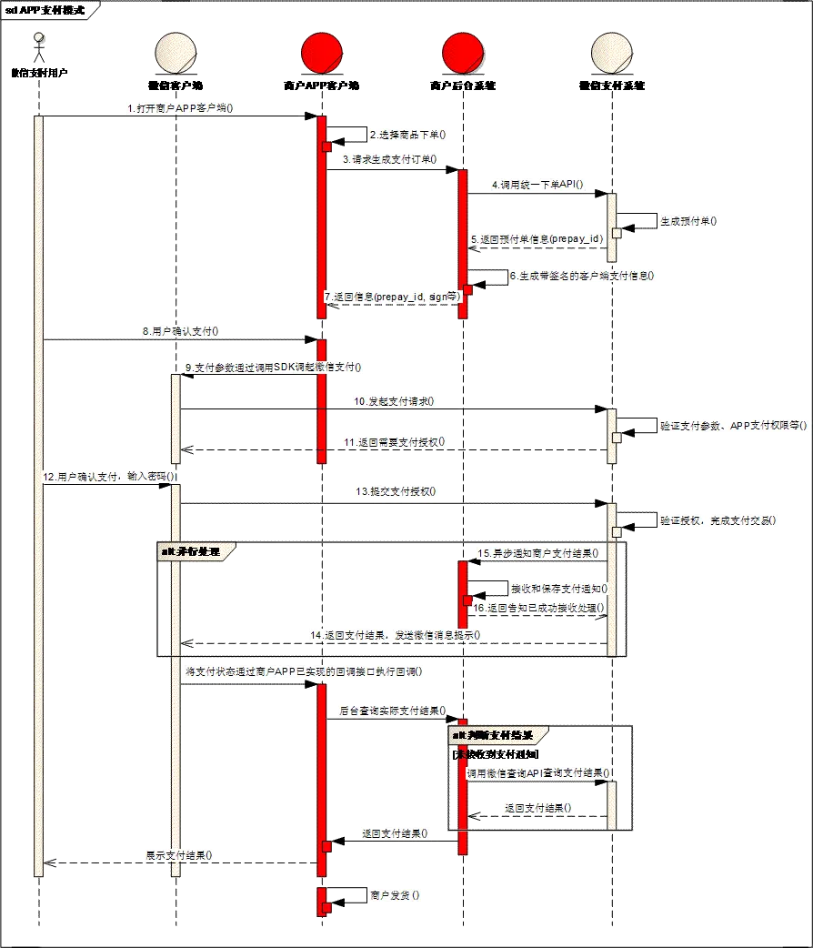 - 步骤1:用户在商户APP中选择商品,提交订单,选择微信支付。