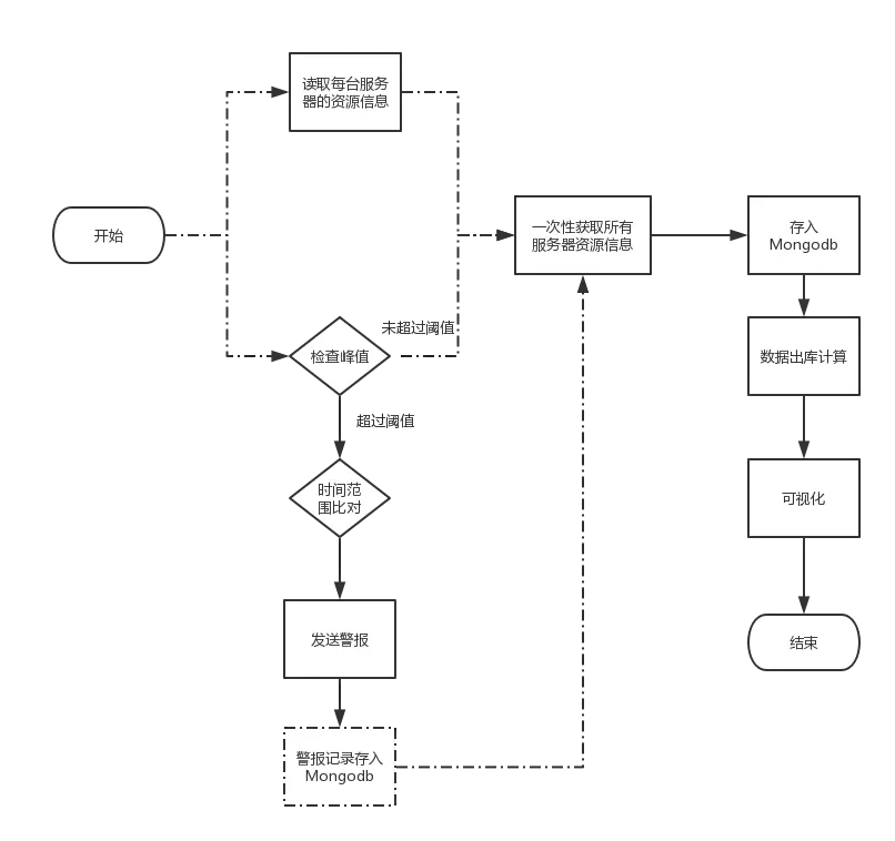首先应该先读取每台服务器的资源,在读取资源的时候检查是否超过阈值,然后主机一次性获取所有服务器资源信息并存入数据库,接着出库计算并将数据处理成可视化图表。所以可以将上面的模块编写顺序做一下调整: