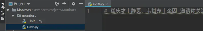 对于这一次的项目,我们新建一个文件夹 Monitors,然后再在里面新建一个 python package 名字叫 monitors,接着在项目内新建一个名为 core.py 的文件,结构如下图所示: