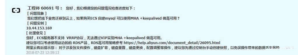 4、keepalived配置文件里加脚本判断mysql是否启动需要首尾写好配置文件阿里云工单反馈截图